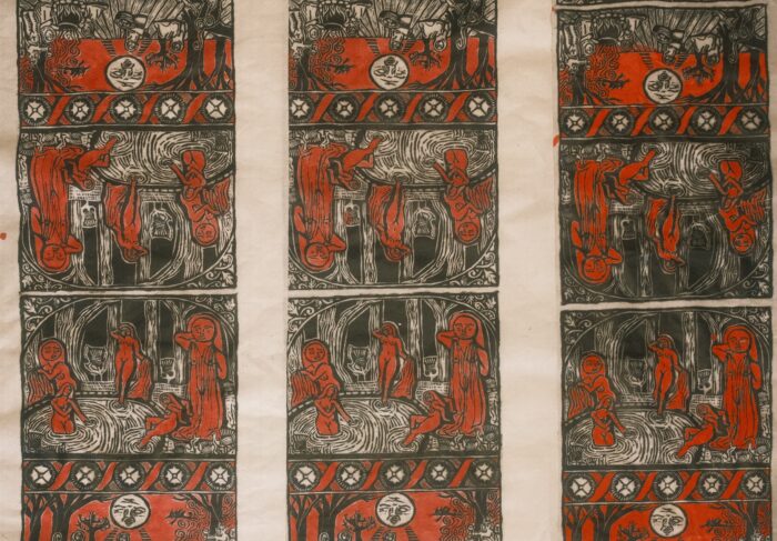 Isla Thomson is a multidisciplinary artist who focuses on recreating historical processes. She uses experimental archaeology to discover techniques of past craftspeople, replicating the techniques in her works to revive forgotten methods. Isla’s practice examines decoration, and why people across the globe have adorned their bodies and homes. She uses traditional printmaking conventions, such as repetition and reflection, as well as incorporating elaborate detail into her works. Her works celebrate these traditional handicrafts, and the women who made them.