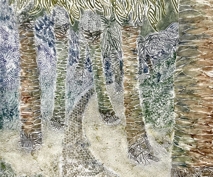 Combining the Greek words kolla: glue, and graph: drawing, Collagraph is a method of printmaking which gives expression to found objects.In Secret garden, impressions of urban natural and unnatural debris are used to depict surreal yet familiar scenes of central Tāmaki Makaurau, where infrastructure and plant life intertwine. These prints remove the line between what is organic and what is not, critiquing illusions of distance from ‘the environment’ as Brie searches for a sense of belonging in the big city.