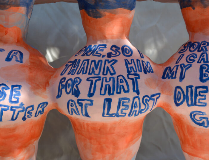 Terms of Endearment considers how intimacy is shaped through language that both reveals and avoids. Using clay and text, the work explores emotional residue, repetition, and the labour of holding what cannot be resolved. Connected forms share one body, offering a physical logic to emotional experience—shared, fluid, difficult to contain. Text appears as declaration, deflection and confession. Memory is carried through touch and material presence, allowing vulnerability to surface without explanation.